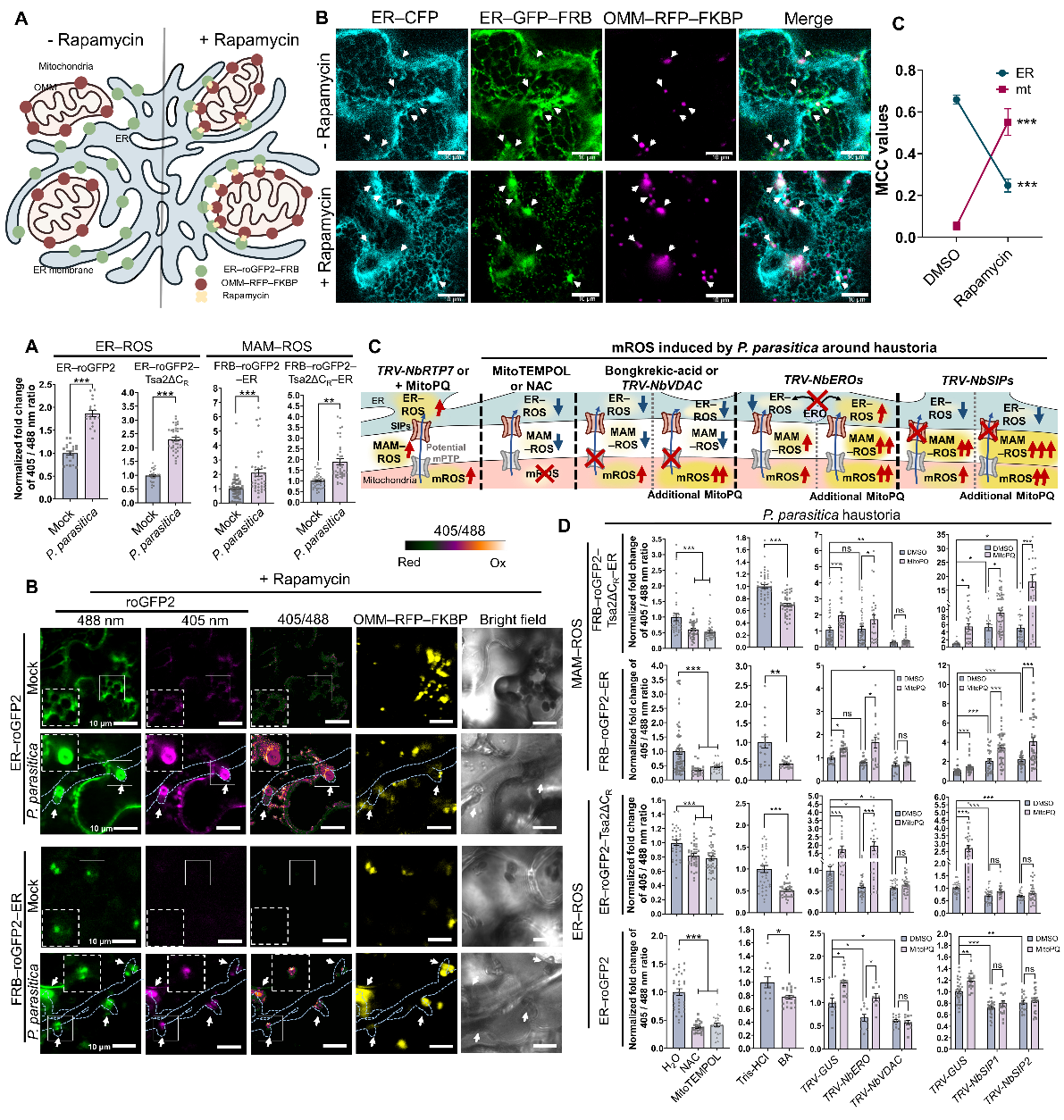 线粒体与内质网互作过程中,会形成线粒体外膜—内质网膜结合位点(MAM)复合体结构。作者进一步通过构建基于split-GFP原理的植物MAM检测方法,结合透射电镜观察,明确了mROS促进吸器周围MAM的形成 (图2),作者由此推测mROS可能通过促进MAM形成,进一步促进线粒体与内质网的ROS信号转运。
