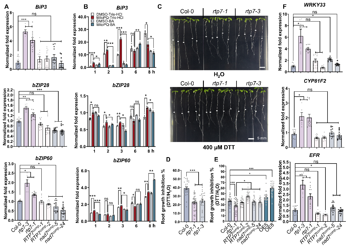 西北农林科技大学单卫星教授课题组前期发现并揭示了线粒体RNA加工因子PPR蛋白RTP7是植物免疫的负调控因子,通过影响线粒体复合体I nad7亚基转录本的内含子剪接,调控线粒体复合体I的活性和mROS水平;发现高水平mROS,而非质外体ROS和叶绿体ROS,是rtp7抗病突变体对多种不同类型病原菌以及非生物盐胁迫表现抗性的关键因素,系统证明了mROS参与调控植物对生物和非生物胁迫的广谱抗性(Yang et al. Plant Cell,2022)。