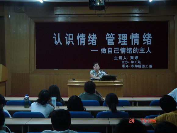 5月24日下午7点30,由农学院团工委组织承办的大学生素质报告会在7号教学楼2层报告厅举行。周婷老师以“认识情绪,管理情绪——做自己情绪的主人”为中心,就现在大学生所出现的一些不良情绪及心理问题,经过长时间的思考及总结,向大家做了一场深刻的报告。