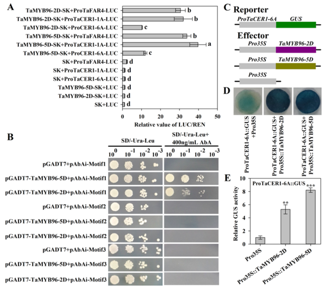 在43份小麦品种(系)中共鉴定出TaCER1-6A的三种单倍型(HapI/II/III)。有趣的是,HapI存在于41份小麦材料中,而HapII和HapII仅存在于一份小麦材料,表明HapI是现代栽培小麦品种中的主要单倍型。与对照相比,干旱和盐处理导致苗期和开花期叶片中烷烃、脂肪醇、脂肪酸、醛和酯的含量显著增加,包括具有不同链长的大多数同系物。此外,研究人员还鉴定到2个R2R3-MYB转录因子TaMYB96-2D/5D。酵母单杂、双荧光素酶和GUS活性实验均表明:TaMYB96-2D/5D直接结合到蜡质合成基因TaCER1-6A、TaFAR4和TaCER1-1A启动子区调控其表达(图3)。