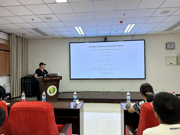 24日上午,徐老师为我院师生作了题为“Estimation of Genetic Variance Contributed by a Quantitative Trait Locus”的学术报告。在报告中,为大家系统讲解了数量遗传学相关的多种遗传参数估计背后的统计学原理,总结了不同统计方法在估计参数中的异同。最后,徐老师介绍了自己课题组的研究前沿进展,鼓励大家勇于钻研,探究数据背后的统计规律。作为数量遗传学和生物统计领域的专家,徐老师深入浅出的报告提高了大家对科研数据的认识和理解。