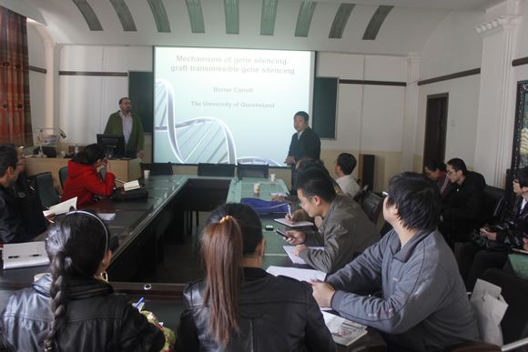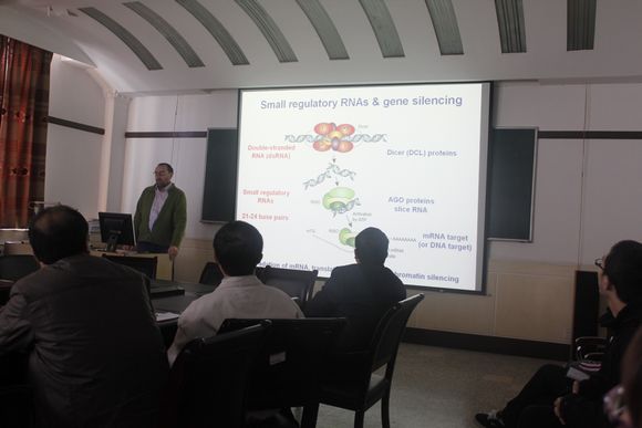 11月9日上午,前来参加2011杨凌国际农业科技论坛的昆士兰大学Bernie Carroll副教授在农学院二楼会议室为广大为师生做了题为“Graft-transmissible gene silencing in Arabidopsis”的学术报告,报告会由海江波副院长主持,农学、生命、园艺等学院40余名师生参加了报告会。Bernie Carroll教授介绍了小RNAs对基因表达的调控和基因沉默机理的研究,miRNA的产生以及在发育过程中队基因表达的调控;siRNA的产生以及在保护基因组、防止转座子的转座、防止病毒入侵和转基因沉默方面的作用机理。着重介绍了他实验室在拟南芥中通过嫁接来研究小RNA从根部来调控地上部分器官的转基因沉默的遗传调节途径,以及利用拟南芥相关基因的突变体研究基因沉默的机理。