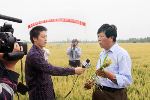 5月13日,孙武学校长、王辉教授在河南省驻马店市检查观摩小麦新品种示范园建设情况期间,接受了中央电视台记者的采访。