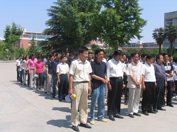 5月19日下午14时28分,我院全体教职工在学院行政楼前集合,集体向汶川大地震遇难同胞默哀3分钟,学院网页也相应地改换了颜色,以表达对遇难同胞深切的哀悼。