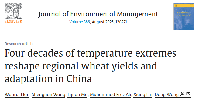 近日,西北农林科技大学农学院王东教授团队在国际期刊《Journal of Environmental Management》发表题为“Four decades of temperature extremes reshape regional wheat yields and adaptation in China”研究论文。我院2022级博士生韩婉瑞为论文第一作者,王东教授为论文通讯作者。