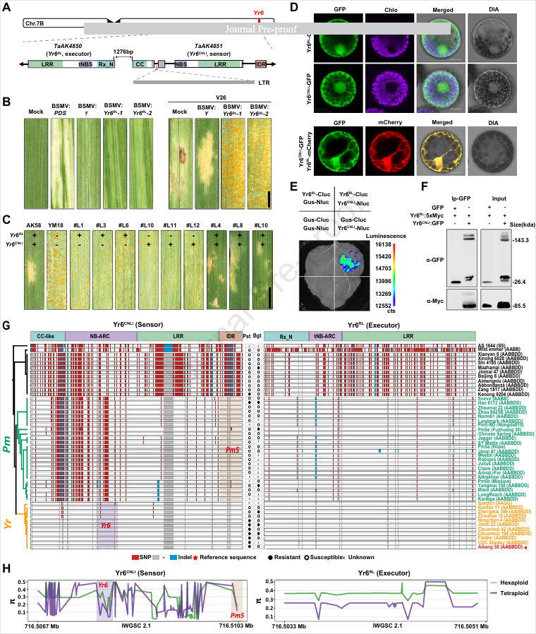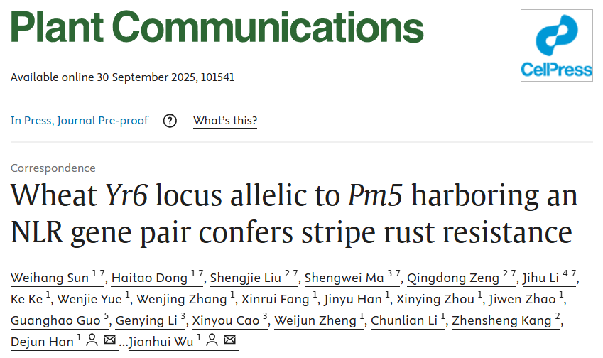 近日,西北农林科技大学农学院小麦抗病团队在国际期刊《Plant Communications》发表题为“Wheat Yr6 locus allelic to Pm5 harboring an NLR gene pair confers stripe rust resistance”研究论文。该研究为利用成对NLR蛋白防控小麦多种病害提供了遗传、分子及进化层面的理论指导。