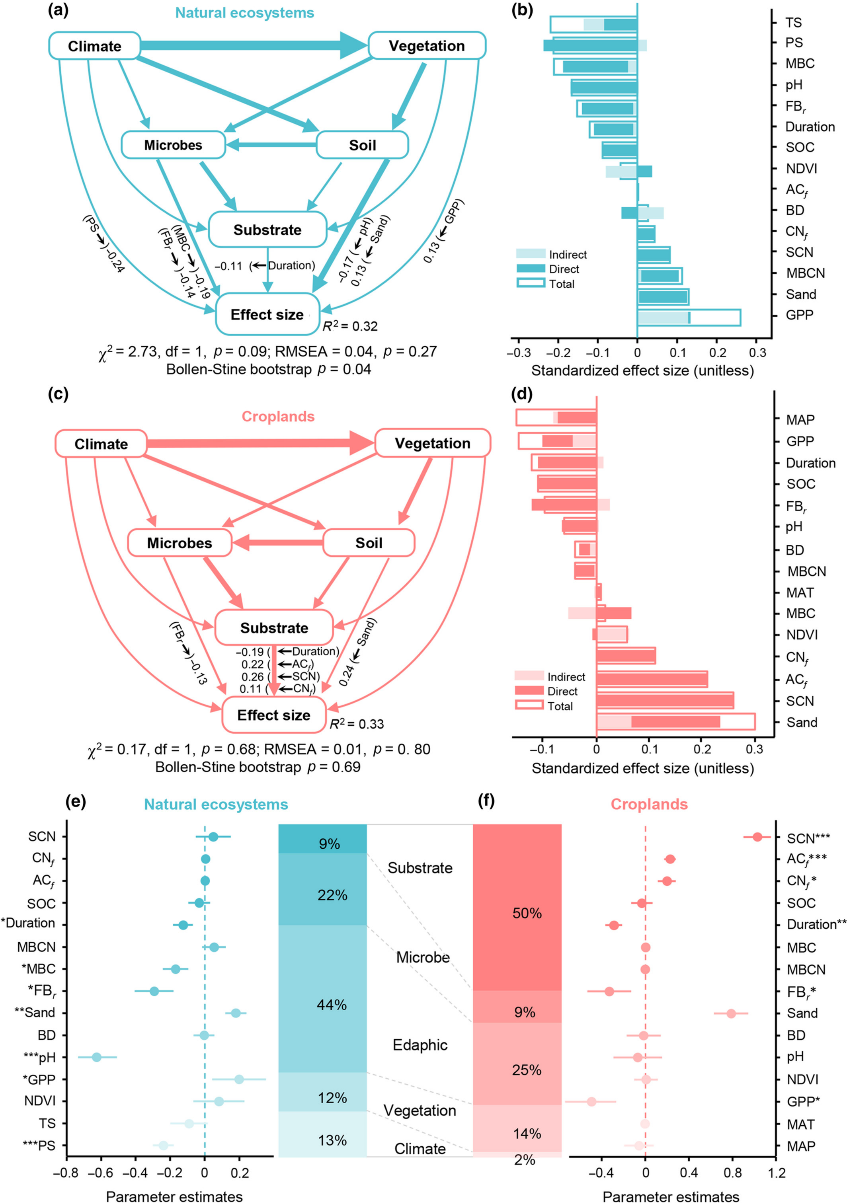 土壤有机碳矿化导致的CO2向大气的排放是陆地碳循环过程的重要组成部分。土壤有机碳矿化速率的微小改变能够显著影响土壤总的碳库大小和大气CO2浓度,最终影响碳循环—气候耦合系统的动态变化。无论是在农田生态系统,还是非农田生态系统,有机物料向土壤的归还在增加土壤固碳潜力的同时,能够显著改变土壤本底有机碳的矿化速率,这种有机碳矿化速率改变的现象被称为激发效应。激发效应的研究可追溯到上世纪20年代,尽管过去大量的研究已经证实了激发效应对土壤固碳能力的影响以及对研究土壤碳动态平衡的重要意义,但是目前科学界对有机物料添加引起激发效应的全球格局、强度和环境驱动因子的定量理解仍非常有限。据此,本研究通过分析来自全球802个土壤样品对有机物料添加的激发效应响应,首次在全球尺度量化了土壤有机碳激发效应的强度、方向及环境驱动在农田和非农田生态系统中的差异表现。结果表明:有机物料添加显著增加土壤有机碳矿化来源的CO2释放,但是农田土壤表现出更高的排放潜力,尤其是旱作农田;有机物料的基本属性(如碳氮比、还田量等)和农田土壤质地是决定激发效应强度的主导因素。尽管控制土壤激发效应的环境因子在农田和非农田生态系统中存在显著差异,但激发效应发生的普遍性特征对理解全球变化导致的有机质质量和数量改变带来的全球碳循环和气候反馈的影响具有重要的理论意义,对“双碳”背景下针对土壤固碳潜力提升的有机物料科学管理实践具有一定的指导价值。