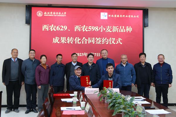 4月7日,学院在203会议室举行西农629、西农598小麦新品种成果转化签约仪式,转让金额达226万元。校新农村发展研究院(科技推广处)常务副院长兼处长王亚平,学院院长兼校长助理单卫星教授,学院党委书记张海成,国家(杨凌)旱区植物品种权交易中心主任宋宇,河南省源泉种业有限公司董事长胡杰清、总经理胡伟等企业高级管理人员,转化品种育种团队闵东红教授团队、学校小麦校外示范园负责人、种子科学系主任及多位小麦育种专家、学生代表参加了签约仪式。签约仪式由学院副院长王东教授主持。